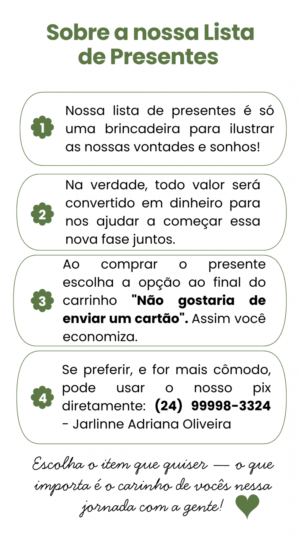 Para nos presentear, fique à vontade para escolher quaisquer dos itens da nossa Lista de Presentes... Aguardamos vocês no nosso grande dia.